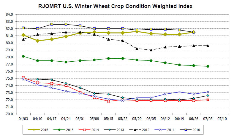 · Blé : en bonne condition 61% good/excellent, 61% semaine passée et 43% en 2015