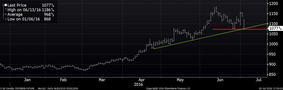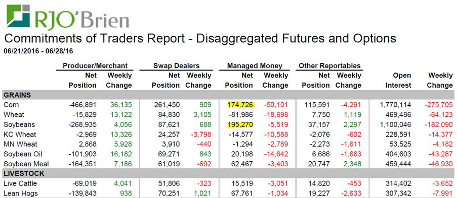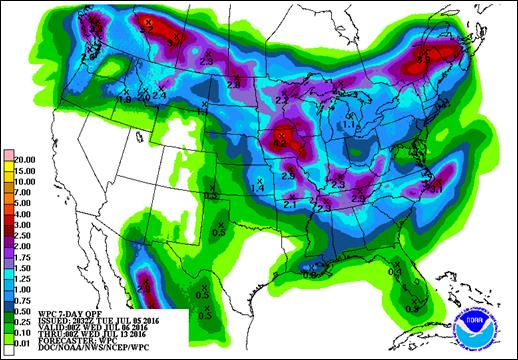 Dès l’ouverture, après un congé de 3 jours, le marché des grains a ouvert en panique maintenant que les cartes météo montrent de bonnes précipitations pour les prochains jours aux É.-U. (image 1). Maintenant qu’on connait les superficies (rapport du 30 juin) qui sont très élevées, que la météo continuera d’être clémente et que les inventaires sont abondants… Le résultat est que le prix du maïs a terminé la journée à son plus bas niveau depuis 2014. Techniquement, il sera difficile de retourner au-dessus de la résistance de 3.65 $US/boiss. (graphique 2) puisque le marché a ouvert avec un gap à la baisse en plus de briser l’ancien support. Le prochain support est à 3.20 $US/boiss., soit les bas de 2014, sinon on a quelques supports entre 3.00 et 3.10 $US/boiss.. Au niveau du soya, la chute a été encore plus brutale aujourd’hui. Le tourteau termine la journée à -20.00 $US/tonne courte (limit down) et le soya sur novembre en baisse de 0.60 $US/boisseau. Pour le prix de la fève, on est à un niveau critique : on teste les bas de la fin juin ainsi que la tendance haussière (graphique 3). De plus, en date du 28 juin, les spéculateurs détenaient toujours une importante position dans le maïs et soya (tableau 4) avec 174,700 et 195,300 contrats net acheteur respectivement. Bien qu’ils aient fort probablement déjà commencé à liquider depuis le 28 juin, il ne serait pas surprenant que ça continue ces prochains jours ce qui pourrait exercer une pression baissière.