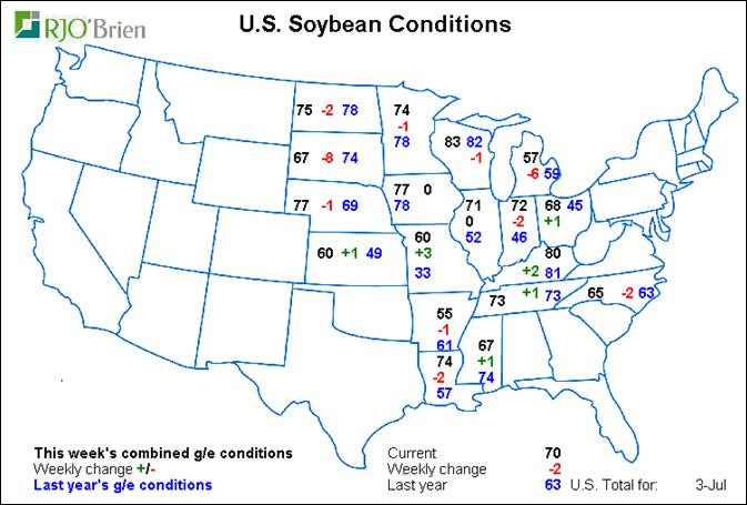 · Condition du soya (image 6) : -2% à 70% b/e versus des attentes à 71% (70-73%). Nous étions à 63% l’an dernier, mais à 72% en 2014.