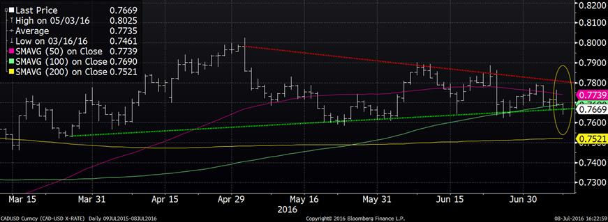 Puisqu’on est le 1er vendredi du mois, les chiffres d’emploi au Canada et aux États-Unis étaient dévoilés ce matin. Aux États-Unis, on s’attendait à 180,000 nouveaux postes alors qu’il s’est créé 287,000 jobs en juin ce qui est très bon, ça vient compenser la faible création d’emploi en mai à seulement 11,000. Avec un taux de chômage à 4.9% (4.7% le mois dernier), les États-Unis sont en situation de plein emploi ce qui permet au salaire horaire moyen d’augmenter de 2.6% depuis 12 mois. La petite hausse du taux de chômage américain est principalement due à une augmentation du taux de participation au marché d’emploi ce qui n’est pas une mauvaise nouvelle en soi. Au Canada, on a remplacé 40,100 emplois à temps plein par 39,400 postes à temps partiel, pour une perte nette de 700 jobs. Le taux de chômage diminue à 6.8% mais cette baisse provient d’une diminution du taux de participation, c’est à l’opposé des américains. Ces chiffres ont exercé une pression baissière sur le taux CAD/USD aujourd’hui qui a terminé la journée à 0.767, c’est la première fois depuis le rallye du printemps que le taux termine la journée sous la moyenne mobile 100 jours (graphique 1). Cela démontre une certaine faiblesse au niveau du huard ce qui pourrait s’accentuer si le CAD brise son support à 76.50 – 76.00.