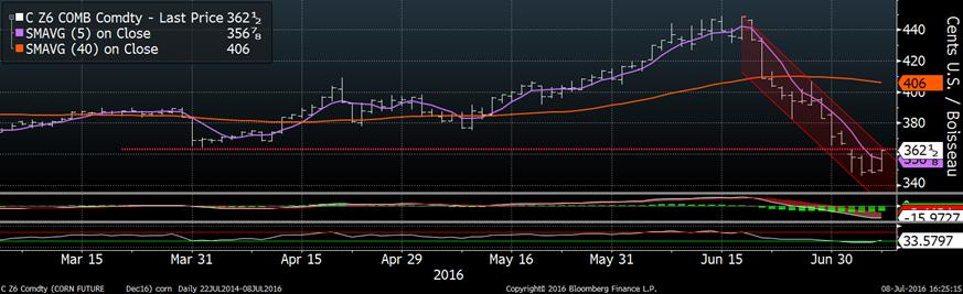 Le marché du maïs recommence à montrer une certaine vigueur depuis que le Brésil a publié des chiffres de production qui étaient plus faibles qu’attendus jeudi matin. CONAB diminue ses prévisions pour la deuxième récolte de maïs par 7 millions de tonnes en raison de la sécheresse au mois d’avril-mai (alors qu’il y avait des inondations en Argentine), ce qui donnerait une production de 43 millions de tonnes versus 50 millions publiées le mois dernier. La production annuelle du Brésil atteindrait donc 69 millions tonnes, bien en-dessous des chiffres de l’USDA à 76 millions. Bien qu’on sache que safrinha avait subi des dommages, ces données surpassent les attentes. Hier, le prix du maïs avait bondi à Chicago après la nouvelle, mais n’a pas garder ses gains contrairement à aujourd’hui. Au final, le prix du maïs termine la semaine où il l’a commencé à 3.63 $US/boisseau. Techniquement, on vient tester la résistance formée par le gap de 3.67 – 3.63 de l’ouverture de mardi matin (graphique 2) et il sera intéressant de voir si on percera cette résistance la semaine prochaine ou pas. Si c’est le cas, ça pourrait déclencher une vague d’achat.