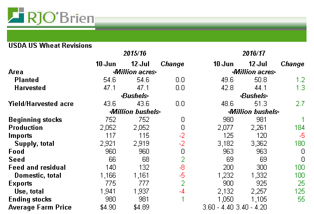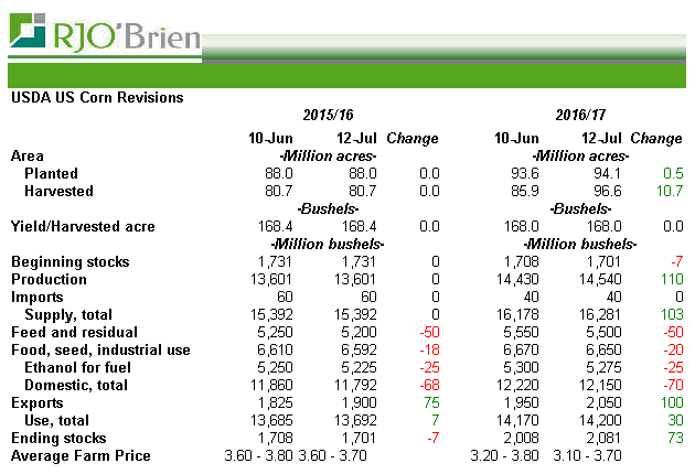 En fait le rapport ne contient pas réellement de surprises sur la nouvelle récolte dans le sens ou la baisse de la consommation s’est fait ressentir dans l’élevage et la production d’éthanol tandis qu’on hausse l’utilisation pour le programme d’export suite à la réduction massive de la production Brésilienne. On s’était attendu à voir plus d’amplitude dans les révisions de part et d’autre, quoiqu’au net le résultat aurait été sensiblement le même (éthanol ↓, élevage ↓, export↑). USDA coupe « seulement » de 50M de boisseaux la consommation dans le feed et cela m’apparait étonnant compte tenu que les stocks étaient 194M plus élevés dans le rapport du 30 juin passé. Il faudrait que l’utilisation de blé d’inde soit incroyablement élevée dans le dernier trimestre pour compenser la baisse de 5.1% dans les 3 premiers et cela m’apparait difficile/impossible compte tenu de l’abondance de blé. Actuellement il semble très optimiste d’augmenter l’utilisation pour l’élevage de 300 millions de boisseaux (de 5.200 à 5.500 milliard pour la récolte 2016/17) car les chiffres ne supportent pas cette vision. L’avenir le dira mais augmenter de 6% la consommation pour la nutrition animale est optimiste quand le troupeau animal augmente de 2-3% et qu’il y a un énorme surplus de blé à bon prix.
