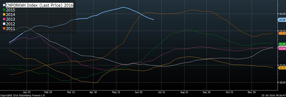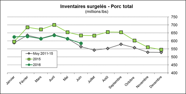 · Inventaires surgelés de porc au 30 juin : 585 millions lbs à en ligne avec la moyenne 5 ans, 8% moins qu’en juin 2015