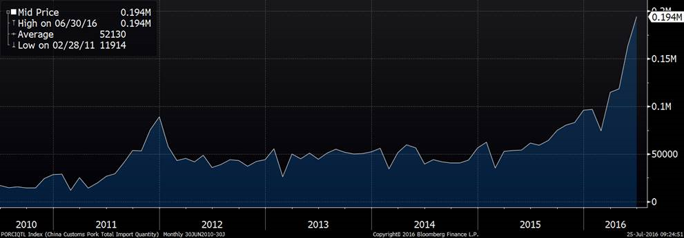 · Importation de porc en Chine (juin) : 194 000 tonnes à un volume record! 18% de plus qu’en mai, 314% de plus qu’en juin 2015