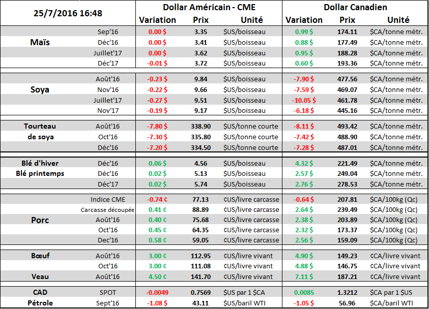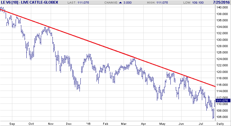 Gabriel en parlait dans le commentaire de vendredi, le rapport USDA sur les bœuf en parc d’engraissement est positif pour les prix. Restait juste à attendre l’ouverture du marché pour constater l’amplitude du mouvement. L’ouverture c’est fait en hausse de plus d’une cents et deux heures plus tard le marché a atteint sa limite quotidienne de 3 cents. Techniquement la tendance baissière des prix du bœuf est toujours intacte. Le marché était très négatif sur les perspectifs longs termes et doit maintenant s’ajuster en conséquence. Un des signes évident d’un marché au sentiment négatif est que les prix des contrats à terme rapprochés transigent plus bas que le prix cash, donc à rabais/discount. Avant le rapport de vendredi, les prix cash se transigeait autour de 1.16 cents la livre, bien au-dessus du 1.08 sur le contrat d’aout. C’est une situation qu’on voit dans un marché très bearish comme c’est le cas avec le bœuf gras. Pourtant la demande n’est pas anémique puisque la valeur de la découpe demeure élevée ; 200.09 $/100lbs pour le choice et 189.57 $/100lbs pour le select – des valeurs qui représentent une marge intéressante pour les abattoirs. Au final, le marché fait son travail de rééquilibrer le prix selon l’offre et la demande, mais même s’il y a moins de placement que prévu, il y a tout de même une augmentation des bœuf en direction des parcs. Au lieu d’une hausse de 6%, c’est une hausse de 3% - mais c’est encore une hausse.