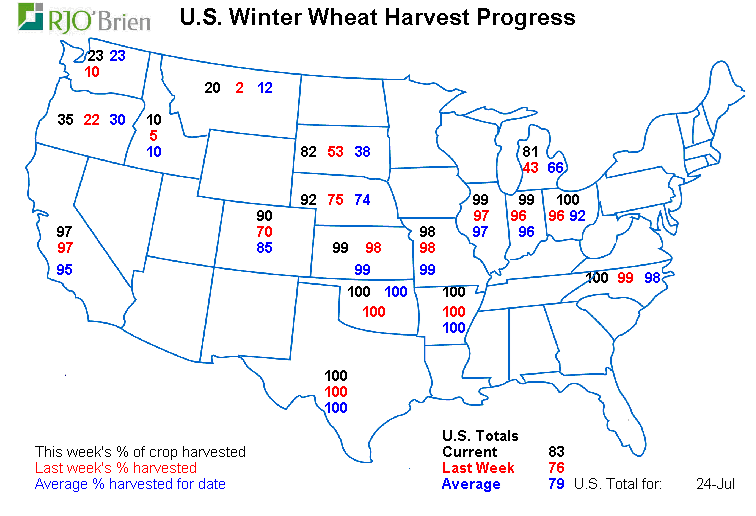 Blé : La semaine dernière la pluie a affecté les récoltes de blé d’hiver qui n’ont pas avancé beaucoup en passant de 76% à 83%. Par contre les états principaux comme le Kansas ou l’Oklahoma ont fini les battages depuis 3 semaines.