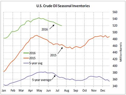En effet, la tendance baissière du prix du pétrole exerce une pression négative sur le dollar canadien. L’or noir se transige sous le barre du 42.00 $US ce qui est une première depuis la mi-avril ce qui coïncide avec la période où le dollar canadien se transigeait au taux actuel. La reprise des opérations au Canada et Nigéria cause un retour de la surproduction mondiale alors que les inventaires de pétrole demeurent excessivement élevés (graphique 1). Les réserves de pétrole aux États-Unis sont à 521 millions de barils ce qui est 12% de plus que l’été dernier alors que c’était déjà des inventaires records, et 37% de plus qu’en 2014.