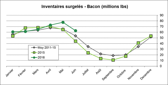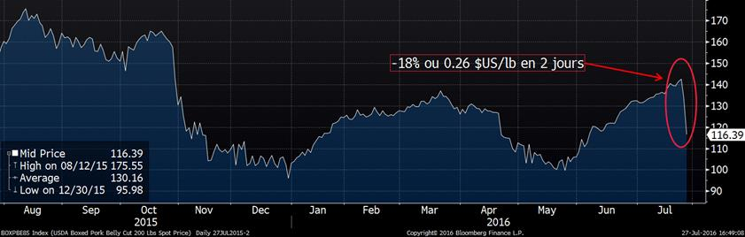 En après-midi, les prix du porc sur août et octobre ont touché la limite journalière de 3 ¢/lb après une dégringolade du prix de la carcasse découpée, notamment le bacon. Au final, le prix du contrat d’août 2016 a rejoint son plus bas prix précédemment établit en novembre à 0.716 $US/lb. Du côté du contrat d’octobre, les bas du mois de novembre ont été défoncés (graphique 2) pour terminer au plus bas prix depuis 2009. Cette vague baissière provient essentiellement de la chute du prix du bacon qui a influencé la valeur entière de la carcasse. Depuis 2 jours, le prix du flanc de porc a chuté de 0.26 $US/lb, soit 18% (graphique 3), alors qu’aucune nouvelle spécifique explique cette correction, autre l’abondance de viande sur les marchés. Vendredi dernier, on apprenait que les inventaires surgelés de bacon étaient plus élevés que l’an dernier (+42%) et que la moyenne 5 ans (+17%), mais la situation n’était pas alarmante (graphique 4). Le prix du porc pour les livraisons de la mi-août 2016 est rendu à 192 $CA/100kg comparativement à 235 $CA/100kg il y a 6 semaines ce qui était le meilleur prix au Québec après 2014.