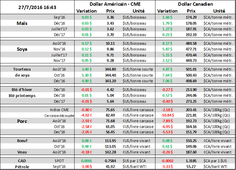 Aujourd’hui, la Réserve Fédérale Américaine (FED) publiait le compte rendu de leur rencontre de 2 jours. Les probabilités de voir une hausse de taux étaient pratiquement à zéro et c’est ce qui est arrivé. Toutefois, dans son communiqué, le comité semble ouvrir la porte à une potentiel hausse de taux pour sa prochaine réunion en septembre suite à une diminution des risques économiques aux États-Unis. D’une part, ils estiment que les répercussions du Brexit sur l’économie américaine ne seront pas majeures. D’autre part, le marché du travail va très bien avec un taux de chômage à 4.9%. Sur la nouvelle, le dollar américain s’est renforcit ce qui n’a pas duré très longtemps puisque l’indice du $US a terminé la journée dans le rouge. Ce repli de fin de journée a permis au dollar canadien de terminer la journée inchangée malgré un baril de pétrole en baisse de plus de 1 $US.