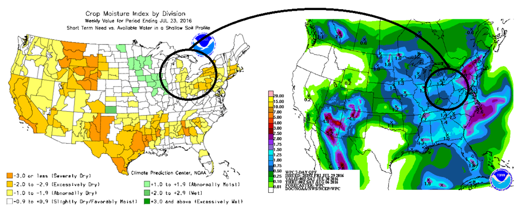 Précipitations prévues dans l’est du belt mais certains endroits sont plus sec et le stress sur la plante pourrait être plus grand. Au moins il annonce un bon pouce d’eau dans les 7 prochains jours.