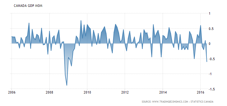 Au Canada le produit intérieur brut (PIB) réel a reculé de 0,6 %, soit la baisse mensuelle la plus marquée depuis mars 2009. Le recul enregistré en mai est principalement attribuable à la diminution de l'extraction de pétrole en raison des feux de forêt et de l'évacuation de Fort McMurray.