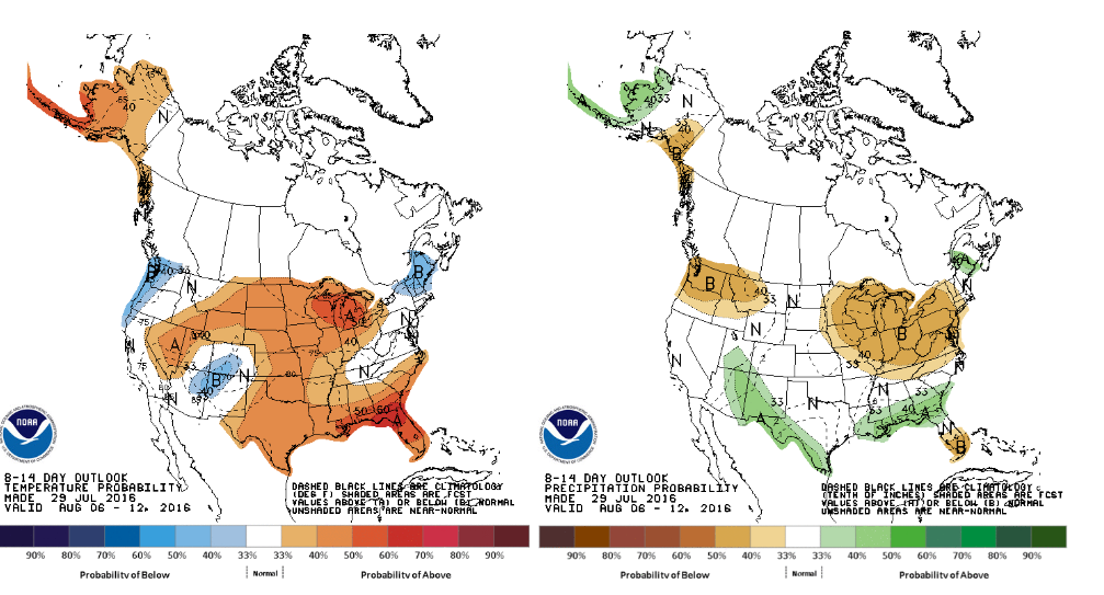 Météo : forecast long terme 8/14 jours (du 6 au 12 aout) montre une probabilité de température plus chaude/sèche qu’à la normal