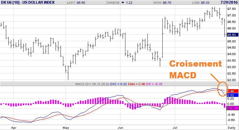 Aux États-Unis, la croissance de 1.2% annualisée a été très décevante puisque les économistes prévoyaient 2.6% et les statistiques ont aussi été revues à la baisse pour les deux derniers trimestres. À la lumière de cette croissance plus faible que prévue, le dollar américain a perdu de la valeur et poussé l’ensemble des devises à incorporer une probabilité encore plus faible à ce que la Fed hausse les taux dans le meeting de septembre. Les membres de la Réserve Fédérale se fient étroitement aux indicateurs économiques afin de modifier, ou non, les politiques monétaires (taux d’intérêt). L’indice du dollar américain a subi une correction significative de 1.25% et certains indicateurs techniques tournent négatif, notamment le croisement baisser MACD. La baisse de la valeur du billet américain fait monter la valeur du $Canadien, malgré le recul du baril de pétrole.