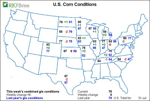 · Condition du maïs : inchangé à 76% bon/exc., c’est la meilleure condition depuis 1994
