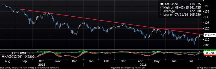 Par moment, les prix du bœuf et du veau d’embouche ont touché leur hausse maximale aujourd’hui pour terminer la journée avec un gain de 2.3 ¢/lb et 4.4 ¢/lb respectivement. Dans l’ensemble, le prix du bœuf est rendu positif depuis le rapport 22 juillet qui démontrait moins de placements qu’attendus, bien que c’était plus que l’an dernier. Depuis son creux de la mi-juillet, le prix du bœuf sur octobre a récupéré 9 ¢/lb et fait désormais face à sa résistance (graphique 3) laquelle n’a jamais été brisée depuis 2015. Définitivement, si le prix du bœuf perce la résistance baissière, ce serait un signal d’achat. Les prochaines résistances sont dans la zone 1.18 – 1.20 $US/lb.