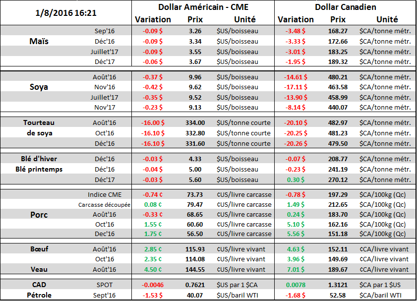 En cette journée fériée canadienne, le Civic holiday, les marchés américains étaient plutôt mouvementés avec un nouveau creux dans le maïs et soya tandis que le marché des viandes a fortement rebondi. En raison de la météo favorable, le prix des grains continue leur tendance baissière. Le prix du maïs a terminé la journée à son plus bas niveau depuis octobre 2014 alors que celui du soya est de retour au niveau de ce printemps. À la lumière du rapport Crop Progress d’aujourd’hui, on ne peut pas dire que la pression baissière est injustifiée. La condition du maïs reste à 76% bonne ou excellente (carte 1) ce qui est la meilleure condition après 1994. C’est également vrai dans le soya avec une condition bonne/excellente à 72% (carte 2) ce qui est mieux qu’en 2014 et 2015 avec 71%. On peut donc s’attendre à ce que les rendements soient très élevés dans le rapport USDA du 12 août ce qui ferait gonfler des inventaires de fin d’année 2016/17. Concernant la reproduction des plantes, la pollinisation du maïs est complétée à 91% (85% en moyenne) alors que le stade pâteux (R4) est atteint pour 30% de la récolte. Dans la fève soya, la floraison est complétée pour 85% de la récolte américaine (79% en moyenne) et les gousses sont apparues sur 54% des plants ce qui est en avance comparativement à la normale ou à l’an dernier. Face à cette condition, un rendement supérieur à 2014 est possible pour le maïs (171 boisseaux/acre) et supérieur à 2015 pour le soya (48.0 boisseaux/acre).