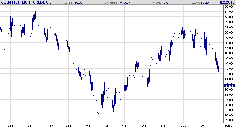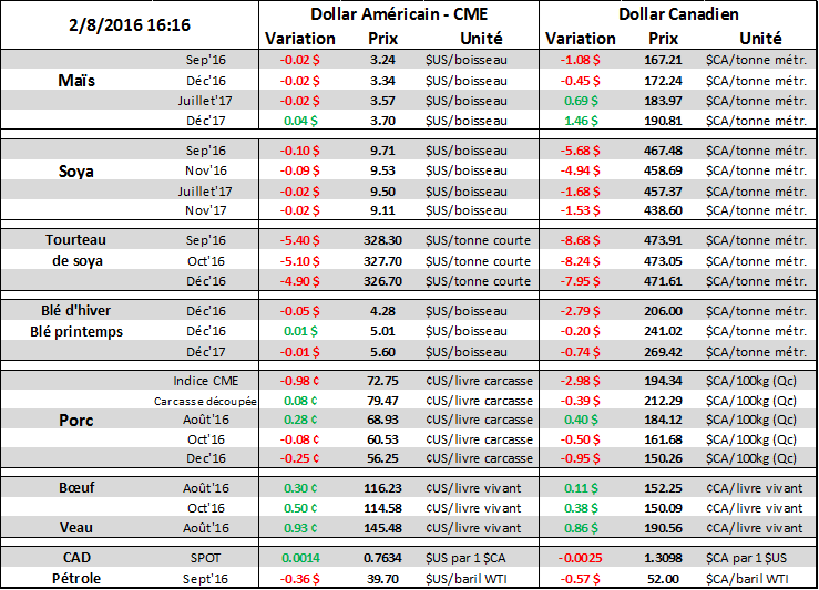 Prix du pétrole à New York continu d’opérer dans la tendance négative depuis le revirement au début juin dernier. Le prix sur base spot (futures septembre) passe sous la barre de 40$, une première depuis le mois d’avril. Les stocks sont encore très élevés et avec le récent regain des opérations de forages le marché à terme doit repousser les surplus à plus loin en 2017. L’impact est négatif pour notre dollar qui a subi la pression pendant toute la journée. Avec les prix CBOT écrasés et les perspective de récolte abondante, le dollar canadien pourrait agir comme bouée de sauvetage pour les prix du grain.