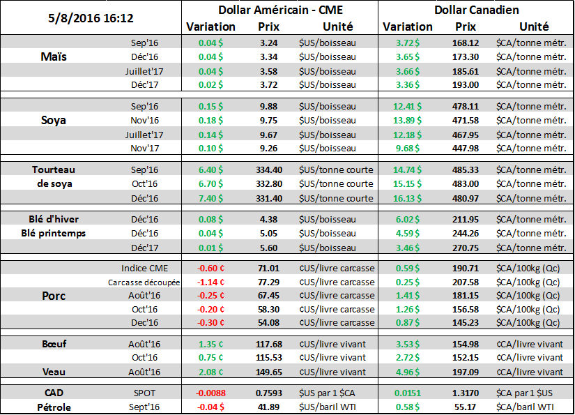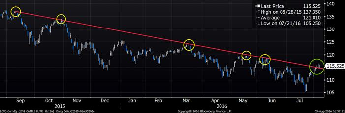 Le prix des contrats de porc demeure toujours dans une tendance baissière avec le contrat d’octobre qui a fait un nouveau creux hier. La production de la semaine était encore plus élevée que la même semaine en 2015, avec des abattages de 2.19 millions de porcs (graphique 2) à un poids moyen de 209 lbs/carcasse (graphique 3), ce qui donne une production de 458 milliards de livres (+3.1%). Dans le bœuf, le prix cash semble assez fort, soutenu par des marges d’abattages positives ce qui n’est pas toujours le cas dans l’industrie bovine. Le prix du contrat à terme est sur une tendance haussière à très court terme et tente de percer la tendance baissière de long terme (graphique 4). Toutefois, la production reste élevée à 474 millions de livres (+6.8%) en raison des abattages très élevés à 579,000 têtes (+8.4%).