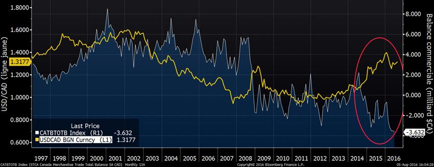 Comme chaque 1er vendredi du mois, les chiffres d’emploi sont venus donner l’heure juste quant à la santé des économies nord-américaines. Aux États-Unis, c’était très bon. On s’attendait à 180,000 nouveaux postes alors qu’il s’en ait créés 255,000 en juillet ce qui laisse le taux de chômage à seulement 4.9% malgré une augmentation du taux de participation. Au Canada, c’était moins fort… On s’attendait à une création d’emploi de +10,000 après un mois de juin sans création d’emploi. Finalement, la statistique est très loin des prévisions avec une perte de 31,200 jobs dont 71,400 emplois à temps plein. Notre taux de chômage a donc passé de 6.8% à 6.9%. En plus de notre chiffre d’emploi, la balance commerciale (exportation moins importations) du mois de juin fût la pire à -3.6 milliards ce qui veut dire qu’on a importé 3,600,000,000 $CA de plus que nos ventes à l’étranger. Apparemment, le dollar canadien n’est pas assez faible pour stimuler l’économie via une augmentation des exportations. Normalement, un taux de change faible comme en ce moment devrait stimuler les exportations et restreindre les importations ce qui n’est pas vraiment le cas (graphique 1). C’est négatif pour la croissance économique du pays et le gouverneur de la Banque Centrale du Canada pourrait être tenté de baisser le taux d’intérêt afin de faire déprécier le dollar canadien pour stimuler l’économie via les exportations. Pour l’instant, c’est l’inverse… la hausse de la balance commerciale handicape la croissance canadienne. Avec à ces données économiques, le dollar canadien à perte 1% face au dollar américain, de retour à 0.76 $US par $CA.