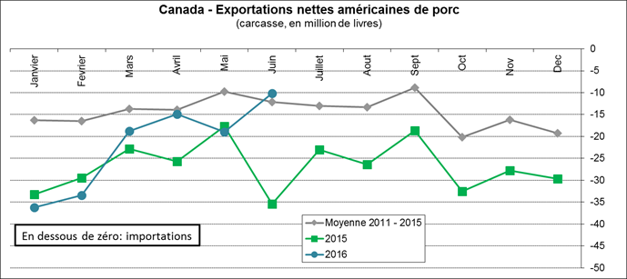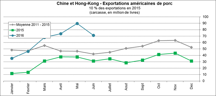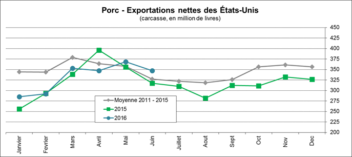 · En juin, les exportations nettes américaines de porcs étaient de 347M lbs, 9% de plus qu’en juin 2015