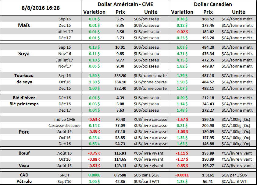 · Condition du maïs: -2% à 74% bon/excellent, comparativement à 70% l’an dernier