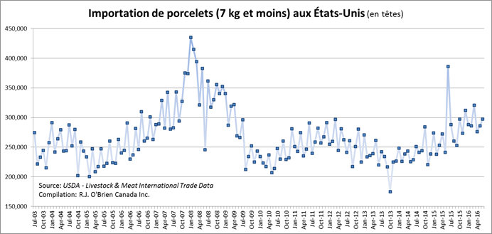 Au début juin, le marché du porc s’était grandement emballé suite aux anticipations d’exportations élevées vers la Chine. En effet, les exportations américaines de porc ont été plus fortes que l’an dernier et qu’en moyenne (graphique 1). Le volume de porc exporté moins celui importé (exportations nettes) totalisait 347 millions de livres, soit 9.4% de plus qu’en juin 2015 et 6.2% de plus que la moyenne 5 ans. Cependant, ce n’est pas directement la Chine qui a fortement influencé la hausse des exportations nettes, mais le Canada. En juin, la Chine avait acheté 71M livres de porcs américains ce qui est 18.5 millions de moins que le mois précédent (graphique 2). Cela est quelque peu décevant étant donné les importations de porc en Chine fracassaient tous les records en juin avec des achats de 194,000 de tonnes (427.5 M livres) ce qui était plus du triple des achats chinois de juin 2015 (graphique 3). Donc, la Chine achète plus, mais pas en provenance des États-Unis. Fort probablement que la Chine a acheté en provenance d’Europe, mais aussi du Canada ce qui expliquerait la chute des importations américaines de carcasses de porcs canadiens. Autrement dit, la Chine achète plus au Canada, donc le Canada vend moins aux États-Unis ce qui fait augmenter les exportations nettes américaines. Même si la Chine n’a pas augmenté son volume, les exportations nettes américaines ont bénéficié indirectement de la forte demande chinoise via le Canada. Plus concrètement, les États-Unis ont importé seulement 10M livres de porcs carcasses en provenance du Canada (graphique 4) contrairement à 35 millions livres en juin 2015. Même si les importations américaines de porcs carcasses canadiens ont diminué, ce n’était pas le cas avec les porcelets de 7kg et moins (graphique 5). On voit que le nombre de porcelets achetés par les américaines maintient une tendance haussière avec près de 300,000 cochonnets.