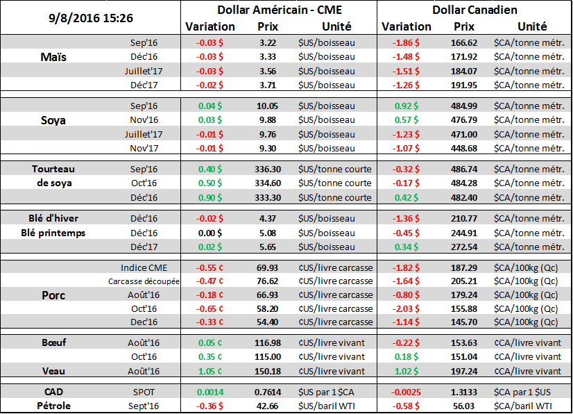 Les fonds de spéculation détiennent encore une position significative dans la fève avec 106 mille contrats/options acheteur, en perte de vitesse par rapport aux 200 mille du début de l’été. Évidemment avec les conditions des cultures exceptionnelles, une bonne partie des gestionnaires de fonds ont abandonnés leur pari d’un prix plus élevé dans le soja. Il reste encore beaucoup de place à liquider la position, un risque à tenir compte si jamais le rapport de vendredi est négatif pour les prix. À court terme le marché rencontre de la résistance aux alentours du 10$, niveau non seulement technique mais aussi psychologiques.