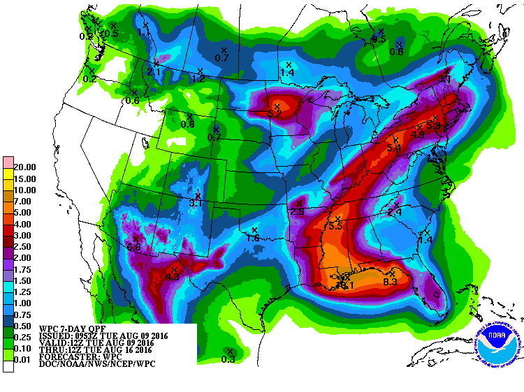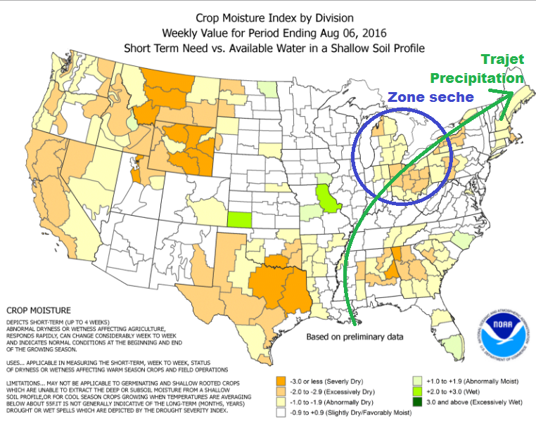Coté météo on s’attend à ce que la tempête présentement dans le golfe du Mexique remonte en longeant le Mississipi pour bifurquer vers le Nord-Est des États-Unis et laisse de 4 à 5 pouces d’eau sur son chemin. Les conditions sèches de l’Ohio vont s’améliorer mais il faudrait voir si c’est trop peu trop tard pour cette région qui a souffert de manque d’eau. Les crop tours laissent entendre que les rendements ne seront pas record dans l’est du cornbelt, mais on ne parle pas de catastrophe non plus.
