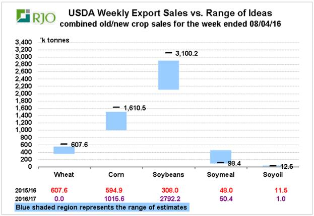 Ce matin, l’USDA publiait les ventes à l’exportation de la semaine dernière lesquelles étaient très bonnes, surpassant les attentes pour le blé, le maïs et le soya (graphique 1). Dans le blé, lequel est déjà dans sa nouvelle année commerciale depuis le 1er juin, les ventes se concentraient sur l’année 2016/17 avec un volume de 607,600 tonnes. Les ventes depuis le début de l’année commerciale totalisent 393 millions de boisseaux ce qui est 20% de plus que les 329 M boisseaux l’an dernier à pareille date. Dans le maïs, lequel termine son année commerciale dans 3 semaines, les ventes totalisaient 1.6 million de tonnes dont 595,000 pour le mois d’août et 1 million de tonnes pour la prochaine année commerciale. Pour l’année 2016/17, le carnet de commande contient déjà 357 millions de boisseaux ce qui est nettement plus que les 200 milllions vendus l’an dernier. On s’attend tout de même à une très bonne année au niveau des exportations américaines de maïs en raison de la baisse de la production en l’Amérique du sud. Notamment, la perte de 15 millions de tonnes de maïs dans la production du Brésil favorisera beaucoup la demande américaine durant l’hiver, il y a pratiquement 14% moins de maïs au Brésil et en Argentine que l’an dernier. Au niveau du soya, les dommages furent moindre que pour le maïs avec une baisse de la production de seulement 3.5% à 153 millions de tonnes au Brésil et en Argentine. La perte de la récolte argentine est partiellement compensée par celle du Brésil. Toutefois, la demande chinoise continue de croître et l’Amérique du Sud ne pourra pas vendre autant de volume que l’an dernier ce qui devrait favoriser la fève américaine. Les ventes à l’exportation du soya totalisaient 3.1 millions de tonnes ce qui est énorme, principalement pour la prochaine récolte. Les commandes pour la nouvelle année commerciale représentent 505 millions de boisseaux comparativement à 356 millions l’an dernier. Autant dans le maïs que le soya, la demande à l’exportation semble être supérieure qu’en 2015/16 en raison de la piètre récolte d’Amérique du Sud, ce qui n’a pas tellement favorisé la demande de blé puisque les compétiteurs sont plutôt en Europe.