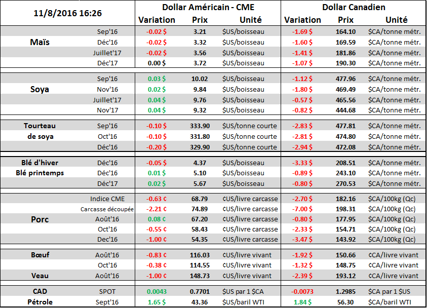 · Prix de la découpe de porc à 74.89 (-2.21) et du bacon à 86.55 (-11.59) ¢/lb