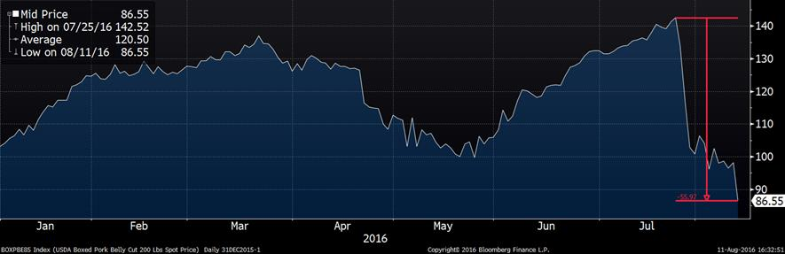 Le prix du porc avait ouvert en force ce matin. D’une part, il brisait la résistance baissière. D’autre part, il y avait un « gap » à l’ouverture (graphique 2) démontrant l’engouement des acheteurs. Le prix d’octobre s’est apprécié jusqu’à +2.5 ¢/lb au cours de la matinée, démontrant des signes de force. Tout cela s’est vite évaporé après la publication des prix des découpes de porc, démontrant une baisse de 2.21 ¢/lb pour la carcasse découpée de porc. Cette baisse de prix est principalement attribuable à la chute du prix du bacon qui a terminé la journée à 86.55 ¢/lb, en baisse de 11.6 ¢/lb. Depuis 3 semaines, le prix du bacon a perdu près de 40% de sa valeur (graphique 3), soit 56¢/lb ce qui est très anormale durant la période estivale. La demande semble être complètement absente cet été pour le flanc de porc. Suite à la publication du prix des découpes, le prix des contrats à termes a changé de direction pour finir la journée négative.
