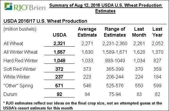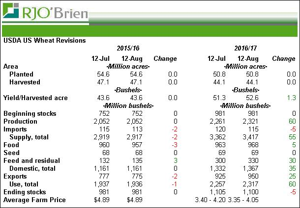 Concernant le blé, la production a été réévaluée de 60M boisseaux, répartie à travers toutes les différentes classes de blé. Selon l’USDA, cette hausse de production ne se reflètera pas dans les inventaires de fin d’année suite à une augmentation de la consommation animale et des exportations. Au final, les inventaires sont légèrement plus faible que dans les estimés du mois de juillet, à 1.1 milliard de boisseaux ce qui représente 47.5% de la demande annuelle américaine… c’est très élevé!
