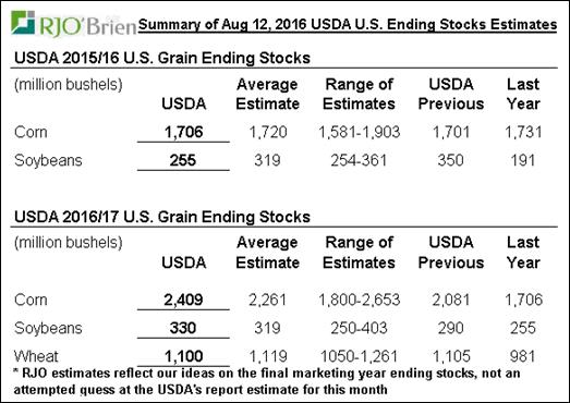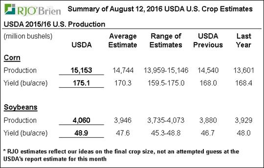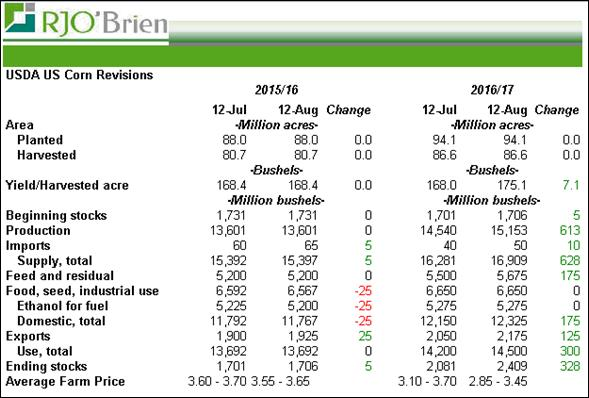 Nous savions déjà que les superficies américaines pour la culture de maïs étaient les 3èmes plus importante depuis plus d’un demi-siècle. À cela se multiplie désormais un rendement record de 175 boisseaux à l’acre (11 tonnes/hectare) ce qui donnera la plus grosse récolte jamais produite aux États-Unis, à 15.15 milliards de boisseaux. Ces chiffres surpassent la moyenne des estimés de 170.3 boiss./acre. L’USDA prévoit donc une production 11% supérieure à celle de l’an dernier ce qui s’additionnera à des inventaires de fin 2015/16 assez élevés avec 1.7 milliards de boisseaux. Au final, il y aura beaucoup de maïs disponible, l’offre sera abondante!