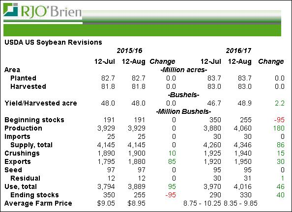 Ensuite, pour la demande 2016/17, l’USDA a aussi augmenté les exportations (+30M) et la trituration (+15M) ce qui laisse des inventaires de fin d’année 2016/17 à 330 millions versus 290 millions de boisseaux le mois dernier. L’augmentation n’est pas drastique, mais l’USDA révise tout de même le prix moyen à la baisse de 0.40 $US/boisseau à 8.35 $ - 9.85 $US.