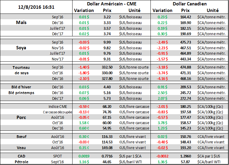 Le plus surprenant aujourd’hui fût la réaction du marché. Après la publication du rapport à midi, le prix du maïs se transigeait en baisse de 7 à 8 ¢/boisseau… mais a terminé la journée dans le vert! Il n’y a pas vraiment d’explication logique pour expliquer ce rebond, certes les prix étaient déjà très faibles, mais je doute que la majorité des acheteurs/vendeurs anticipait déjà une si grosse récolte.