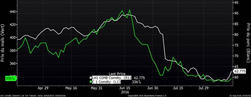 Graphique 3 – Prix du maïs (vert) et prix du porc (blanc)
