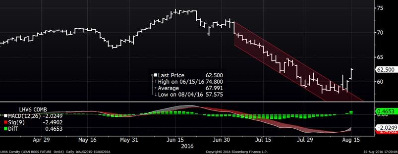 Les abattages de la semaine dernière n’étaient pas tellement élevés, autant pour le porc que le bœuf. Il s’était abattus 2.236 millions de porcs ce qui est seulement 0.9% de plus que la même semaine en 2015 (graphique 4). À cela se soustraie un poids plus léger pour une production de 0.7% à 465.7 millions de livres. On note que la perte du poids des carcasses comparativement à l’an dernier pourrait être attribuable à une diminution de l’utilisation de la ractopamine aux États-Unis, afin de satisfaire les critères chinois. Dans le bœuf, les abattages étaient de seulement 581 000 têtes, sous le volume de l’an dernier par 0.7%. Ce n’est pas arrivé souvent ces derniers mois que l’abattage de bœuf roule sous la quantité de 2015 ce qui explique la force du prix cash. Normalement, le prix du bœuf d’août est inférieur à celui des livraisons d’octobre en raison de l’offre abondante d’animaux qui sortent des parcs d’engraissement pendant l’été. Cette année, la contraction subite des abattages a fait monter le prix cash se reflétant à travers le marché à termes avec un contrat à terme d’août qui est 2.3 ¢/lb au-dessus des livraisons d’octobre. L’écart actuel représente un record de plus de 30 ans alors que la moyenne soit des livraisons d’août 2 ¢/lb sous le prix d’octobre.