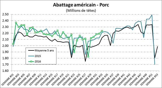 · Production hebdo de porc : +0.7% versus 2015 à 465.7 millions lbs