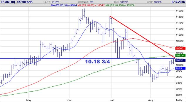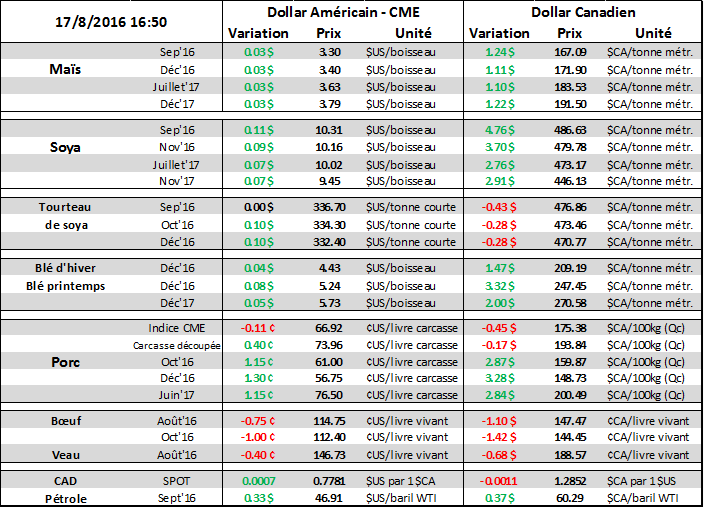 Soja : une autre journée où l’USDA annonce des ventes pour la nouvelle récolte, un total de 381,000 tonnes métriques cette fois ci qui s’additionne au plus de 2.5 millions de tonnes bookés depuis le début du mois. Pour le prix de novembre-16, nous sommes toujours au-dessus du 10$ avec la force de l’exportation ainsi que la faiblesse du dollar américain qui favorise la demande. Les cours actuels sont en train de tester un niveau technique très important. L’analyse technique permet de constater une figure de renversement de type « tête-épaule » et chatouille maintenant l’importante résistance du canal baissier à 10.18$bu. Si jamais les prix franchissent cette résistance cela confirme, toujours sur une base technique, le renversement de vapeur. Les prochaines résistances seraient à 10.30 et 10.54 sur les moyennes mobiles 100 et 50 jours.