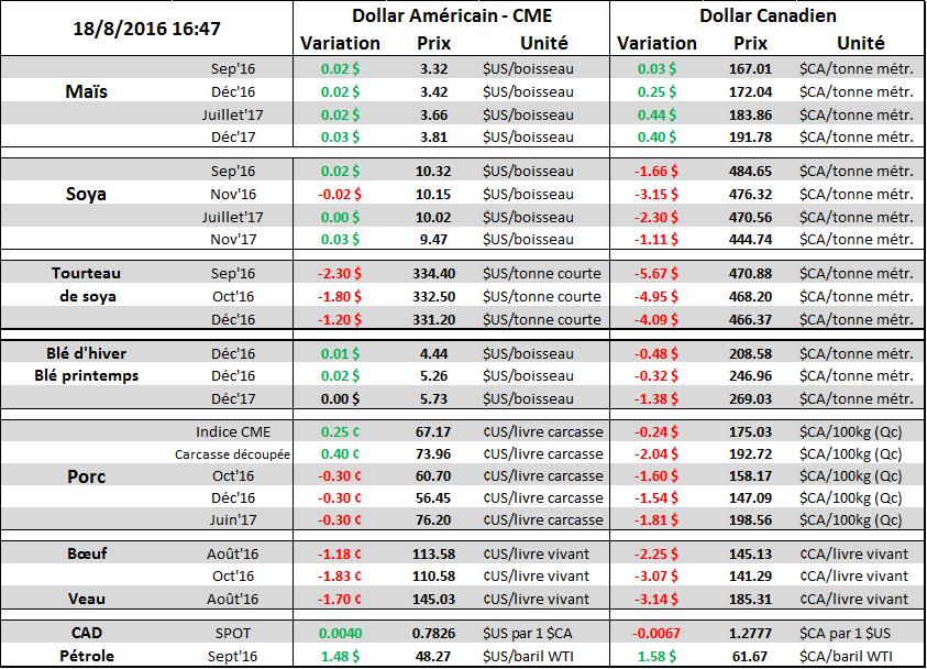 Les exportations de soja ont été solides encore cette semaine, quoiqu’un petit répit par rapport aux ventes fracassante de la semaine dernière. Des ventes de 178,000 tonnes sur l’ancienne récolte versus 1.598 million sur la nouvelle, somme toute à l’intérieur du range attendu. Sur l’ancienne récolte qui tire bientôt à sa fin dans deux semaines, la situation est réellement de savoir quel sera le volume qui sera roulé dans la prochaine année de commercialisation 2016/17. Jusqu’à maintenant les ventes cumulatives s’élèvent à 1.942 milliard de boisseaux qui est plus élevé que la cible USDA de 1.880, mais il reste encore 176 millions de boisseaux qui patientent dans les ports américains en attente de livraison. Ce n’est pas inhabituel de voir un volume roulé dans la prochaine récolte mais 176 millions est deux à trois fois plus élevé qu’à la normale. L’export va bien – c’est ce qu’il faut retenir. D’ailleurs le focus est beaucoup plus orienté vers les ventes sur la nouvelle récolte qui sont très bonnes là aussi ; 58.7 millions de boisseaux cette semaine, plus 102.6 la semaine dernière met le programme d’export américain excellent. À date les bookings de nouvelle récolte atteignent 564 millions de boisseaux, une nette amélioration comparativement à l’an passé avec 384 millions (quasiment deux fois plus fort cette année). Par contre faut mettre en relief que la demande l’an passé était anormalement faible, donc l’écart actuel semble encore plus évident. La demande chinoise est grandement responsable de la vigueur des exportations américaines. En date du 11 aout, les ventes en Chines sont évaluées à 6.519 millions de tonnes contrairement à 4.026 l’an passé. Aussi, l’USDA juste cette semaine, est rendu à 758,000 tonnes de ventes de fève en Chine.
