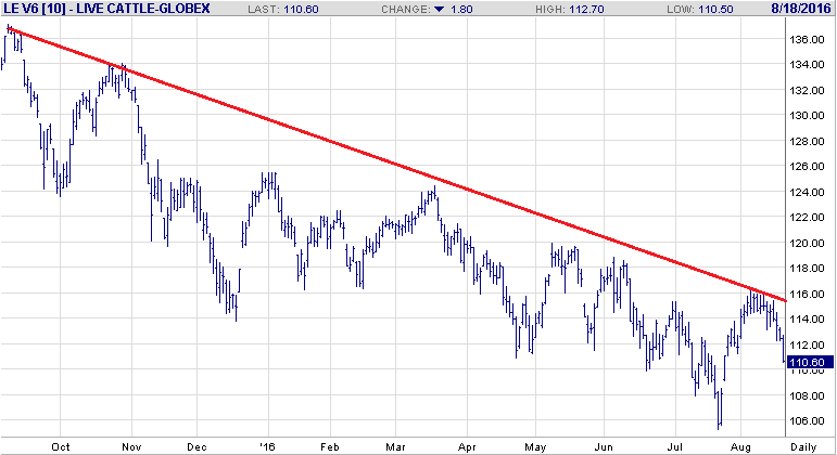 Demain on mettra les informations à jour concernant l’élevage bovin via le rapport mensuel Cattle-On-Feed. Le marché s’attend à une légère augmentation des bœufs en parc d’engraissement. L'un des principaux facteurs qui influent sur le rapport de ce mois-ci est la différence de jours d'abattage entre Juillet 2016 et 2015. Cette année, juillet avait deux jours de moins d'abattage qu’en 2015. Donc en ajustant selon un rythme journalier et non mensuel, le marketing est plutôt en hausse de 10% et supporte donc les chiffres d’abattage qu’on voit actuellement. Pour ce qui est des placements, là aussi ce n’est pas évident – on le remarque bien avec les estimés qui varient entre une baisse de 5% et une hausse de 4%. Bref, il n’y a pas un réel consensus. La difficulté à déterminer les placements vient du fait que 1) les marges des parcs ont été en baisse durant l’été 2) le prix du maïs a baissé certes mais peut-être un peu tard pour avoir un impact sur les placements de juillet et 3) les conditions des pâturages ont été très bonnes ce qui peut inciter les ranchers à conserver les animaux plus longtemps avant d’entrer en engraissement. Aussi, les importations de veaux d’embouche ont été beaucoup plus faibles cette année comparée à 2015. L’information sort demain à 3PM – le mois dernier le rapport était positif pour les prix, mais on n’a jamais été capable de se sortir de la tendance bearish très lourde (graphe plus bas).
