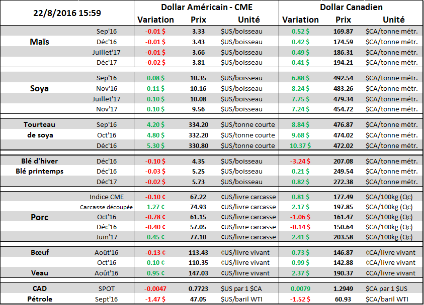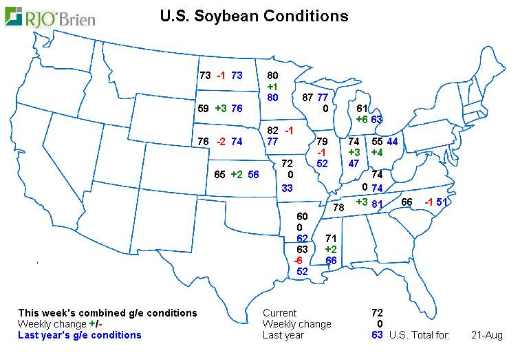 Maïs : la maturité avance très bien avec 85% stade pâteux R4 en avance d’une semaine environ. Le blé d’inde est denté R6 à 40%, là aussi en avance sur le calendrier. Pour ce qui est de la qualité on assiste à un rebond de 1% de la catégorie bon/excellent. L’amélioration à l’est (Ohio, Indiana, Michigan) est responsable de la hausse de 1%. Reste à voir si le ProFarmer Crop Tour qui débute aujourd’hui donne le même signal. À suivre, mais historiquement ils ont tendance à sous-estimer les rendements face aux chiffres de l’USDA à 4 des 5 dernières années ainsi que 5 des 7, donc à prendre avec un grain de sel (?).