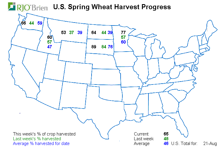 Blé Printemps : La récolte avance à grand pas avec 65% de battu dans les états du Nord-Ouest américain (99% de la production). La récolte ressemble à l’an passé en termes de rapidité.