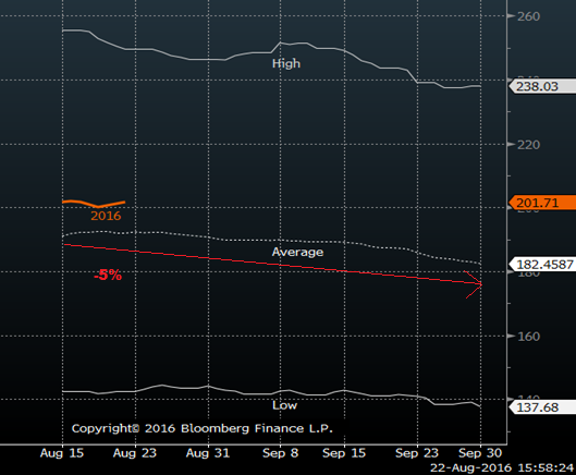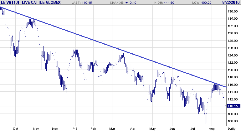 Les prix du bœuf à l’ouverture ont respecté la logique selon les prévisions du rapport COF vendredi. Les placements qui sont légèrement plus fort que prévu ont pesés négativement sur les prix à l’ouverture. La tendance bearish est toujours intacte, mais à court terme on surveille le gap entre 109.10 et 108.525 comme étant le principal support. Le prix cash demeure élevé à 118$, ce qui incite les acheteurs à se couvrir sous les 110$ ou les producteurs à lever les hedges. L’offre est abondante avec l’abattage à 599,000 têtes la semaine passée contrairement à 578,000 la semaine d’avant. La découpe demeure élevée par rapport au cash avec Choice 200$ et Sélect 193$ ce qui maintient le prix cash élevé à l’aube du long weekend de la fête du travail. Comme dirais Roch à Helen, l'été qui s'achève tu partiras, c’est le dernier « vrai » BBQ de l’année, ensuite on assiste en moyenne à un déclin de 5% de la valeur de la découpe d’ici la fin du mois de septembre.