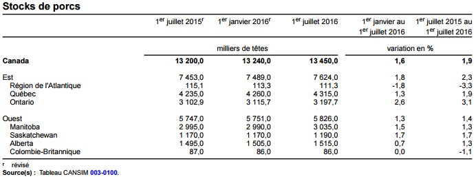 · Cheptel canadien de porc : 13.45 millions, soit 1.9% de plus qu’en 2015