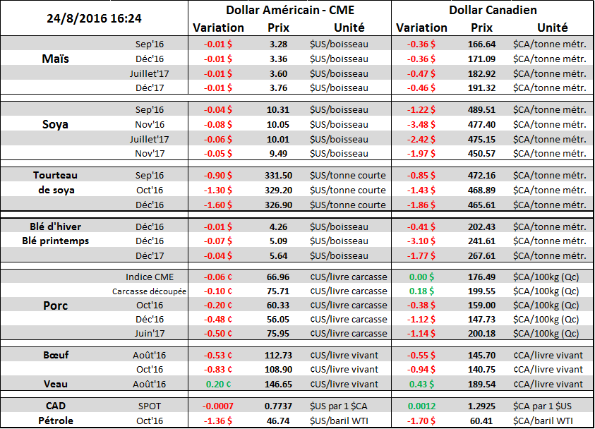 L’abattage de porcs au Canada a augmenté de 1.3% au cours de la première moitié de 2016, à 10.6 millions de têtes. Pendant cette période, la production de porcelets est de 14.4 millions, en hausse de 2.2% comparativement à la même période en 2015. Finalement, le Canada a presque exporté la même quantité de porcs que l’an dernier, à 2.9 millions. La demande américaine reste très forte ce qui n’est pas surprenant puisque le taux de change moyen durant le 1er semestre de 2016 était de 0.75 $US versus 0.81 $US par 1 $CA pour la même période en 2015.