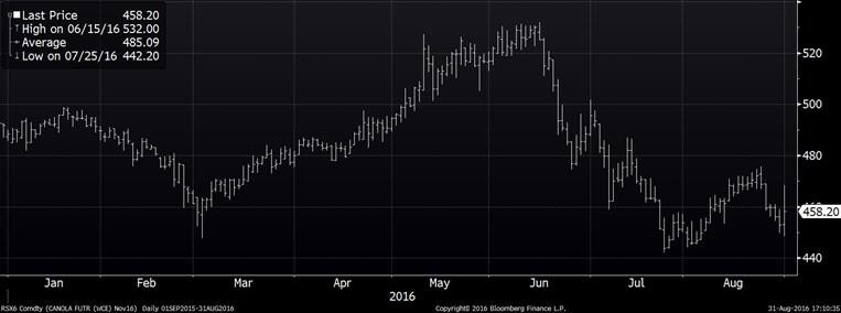 Prix du Canola de novembre 2016 ($CA/tonne)