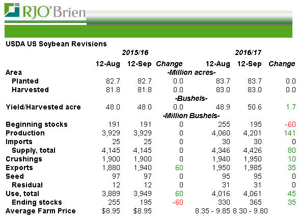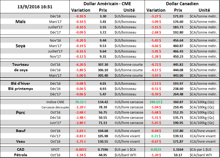 L’USDA a été très cohérente dans son augmentation de l’utilisation pour l’exportation. La force de l’export depuis le mois de juillet a été très soutenue et le ministère pose le bon geste afin de bien refléter la situation. Le ministère a fait deux majeures révisions dans ses projections. Primo le rendement passe de 48.9bpa à 50.6bpa soit une augmentation majeure de 1.7 bpa qui augmente la taille de la récolte de 141 millions de boisseaux. Secundo, la demande a été ajustée principalement au niveau de l’exportation. Tant l’ancienne (+60M) que la nouvelle récolte (+35M) ont été relevés pour suivre la cadence des dernières semaines. Au net l’augmentation du rendement couvre entièrement l’exportation supplémentaire et les stocks de fin grimpent à 365M de boisseaux. L’important à retenir ici c’est qu’on a une très grosse confrontation entre l’offre et la demande et le bilan n’est pas flexible du tout. D’un côté une production record fait monter les inventaires, mais de l’autre l’utilisation est aussi très forte ce qui maintient les traders très nerveux car un petit changement d’un bord ou de l’autre aura un impact considérable. Le rendement est record et il se doit de l’être! Au niveau de la demande, tout se joue en Chine qui selon le ministère s’apprête à réduire leur importations de 1 million de tonnes (86MMT versus 87MMT) cette année puisqu’ils se mettent à utiliser leur inventaires stratégique. Le Brésil et l’Argentine s’apprêtent à semer des surfaces importantes et le rendement doit être au rendez-vous. Aux USA les américains vont bientôt sortir les batteuses avec le soja mature à 26% de perte de feuille. Décidément c’est l’automne… reste juste à tolérer les saveurs à la citrouille dans tout ce qui existe. Café, muffin, biscuit, chandelle name it…
