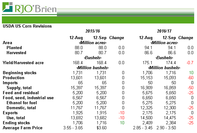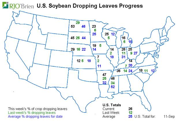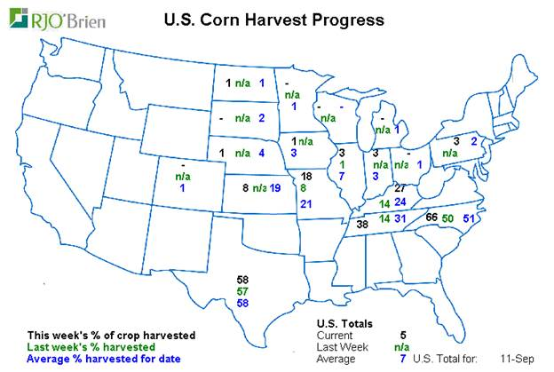 Maïs : Très peu de révisions ont été apportées au bilan offre-demande. Le rendement est revu en légère baisse par rapport au mois dernier mais demeure très élevé à 174.4 boisseaux à l’acre et laisse la production à des niveaux record. La baisse du rendement de 0.7 bpa est contrecarrée par une légère baisse de la consommation dans la filière de la nutrition animale. Au net les inventaires de fin sont quasi inchangés à 2.4 milliard de boisseaux. Le marché avait fondé un peu d’espoir que le ministère baisse le rendement plus que ce qu’on a vu hier d’où la réaction négative des prix. Ce n’est pas la première fois que j’en parle et je continue de trouver hyper suspect la projection d’utilisation pour le feed. L’USDA prévoit une augmentation de 450 millions de boisseaux pour atteindre 5.650 milliard, c’est une hausse de 9%. Et si j’ajoute les 200 millions de boisseaux de blé, l’augmentation devient encore plus imposante. Au même moment dans le même rapport, l’USDA prévoit une augmentation de la production de viande entre 2.5% et 3.4%. Bref la récolte est solide et les lectures de rendement vont commencer à sortir. Actuellement 33% du blé d’inde a atteint sa maturité et les battages sont commencé à 5% principalement dans le sud. Les prix faibles et les bases en baisse risquent de faire en sorte que les cultivateurs vont prendre leur temps avant de sortir au champ (si la météo le permet), question de laisser sécher le grain naturellement et couper dans les frais de propane/gaz.
