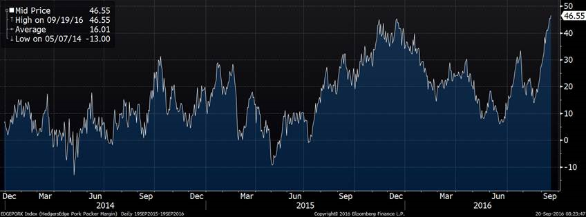 Les abattages de la semaine dernière est de 2.36 M têtes ce qui n’est pas tellement loin de la capacité d’abattage (environ 2.45M)… et nous sommes seulement au mois de septembre. Il y a donc beaucoup d’inquiétude face à la situation pour décembre prochain. Le rapport Hogs & Pigs du 30 septembre sera déterminant pour la prévision des abattages du mois de décembre.